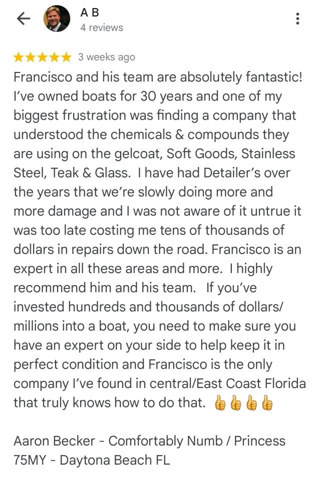 Francisco and team are true professionals that take the boat detailing trade seriously. Each boat that they work on is treated as if it were their own and brought to the best condition possible! I really appreciate the commitment to quality work.